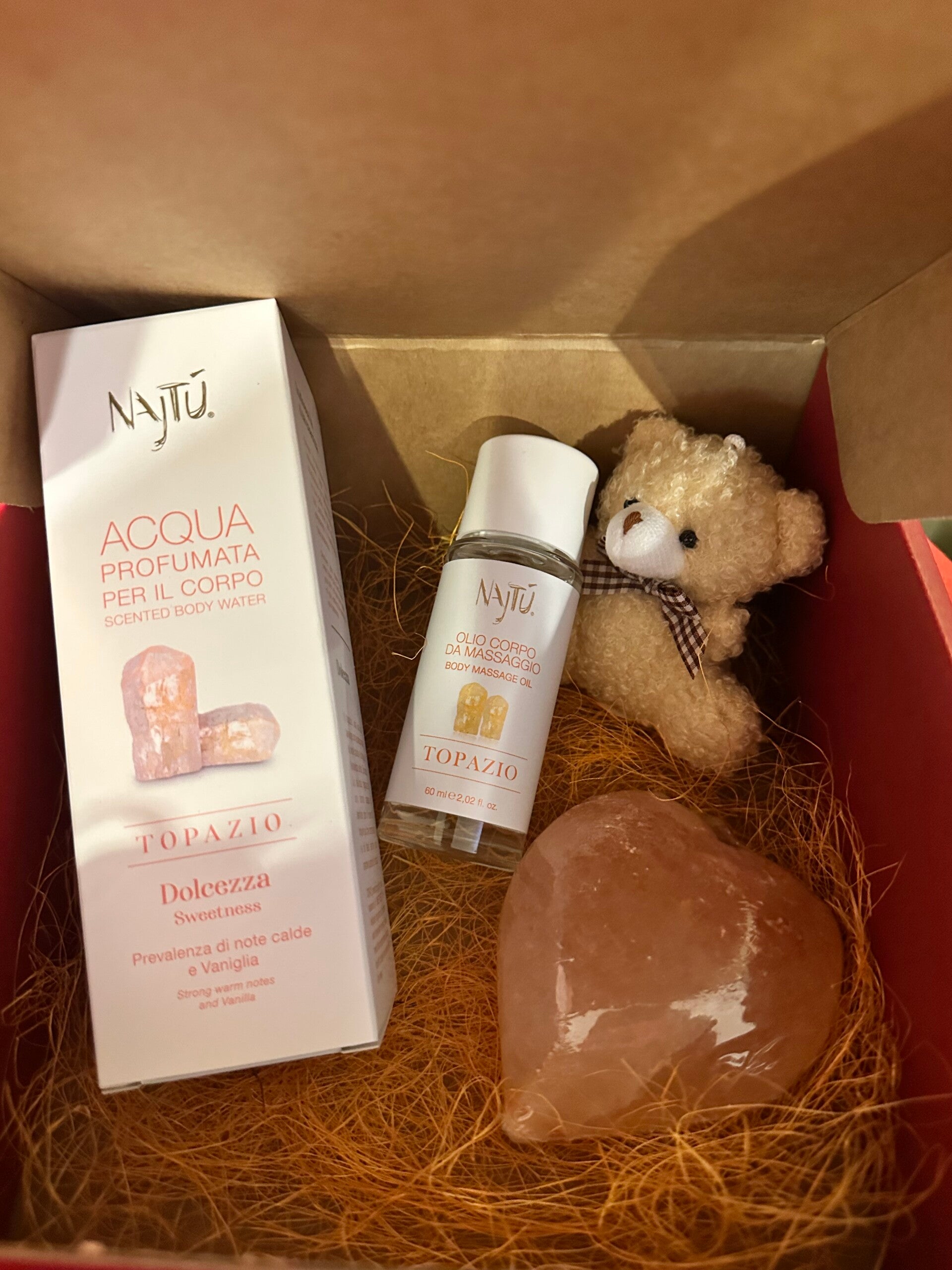 Scatola “AMORE” olio corpo da massaggio al topazio con pietra di sale con cuore e acqua profumata per il corpo al topazio